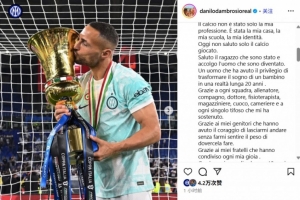 体育资讯8月30日讯 今日,国米旧将丹布罗西奥在个人Ins上发表长文,宣布退役。