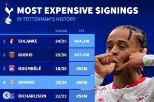 据德转数据统计,6000万欧签下西蒙斯是热刺队史第四贵引援。