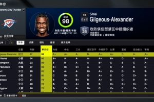 体育资讯8月30日讯 今日NBA 2K26正式发布,雷霆队球员能力值如下: