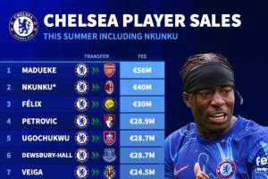 1:马杜埃凯 前锋 5600万欧元 切尔西→阿森纳