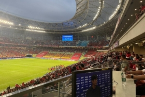 黄健翔在个人微博写道:成都蓉城x上海海港。第一次来凤凰山体育场解说。第N次来成都解说比赛。解说席放在这个位置的球场,个人还是第一次遇到,视野倒是不错,体验很独特。球场很漂亮!