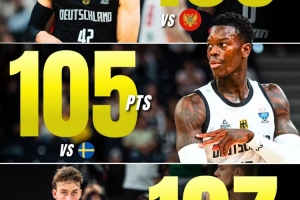 三场比赛德国分别是106-76击败黑山、105-83击败瑞典还有今天107-88击败立陶宛,三场比赛场均拿下106分,排在赛事第一。